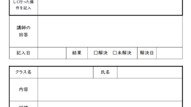 ダウンロード 【講座生専用】質問シート 学習を進めていると、多くの疑問点が出てくることと思います。質問がある方は、質問シートにご記入の上ご質問ください。原則、質問は講座時間内にお願いします。質問シートはこのページ下部のオレンジ色のボタンよりダウンロードできます。※質問は、講座生の... 2023.10.24 ダウンロード